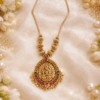 “Round temple-style gold pendant with intricate filigree work, a central deity motif, delicate beaded borders, and ruby-studded accents on a fine gold chain.”