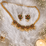 Traditional antique choker featuring ruby and emerald-tone floral motifs with delicate pearl hangings, paired with matching earrings.