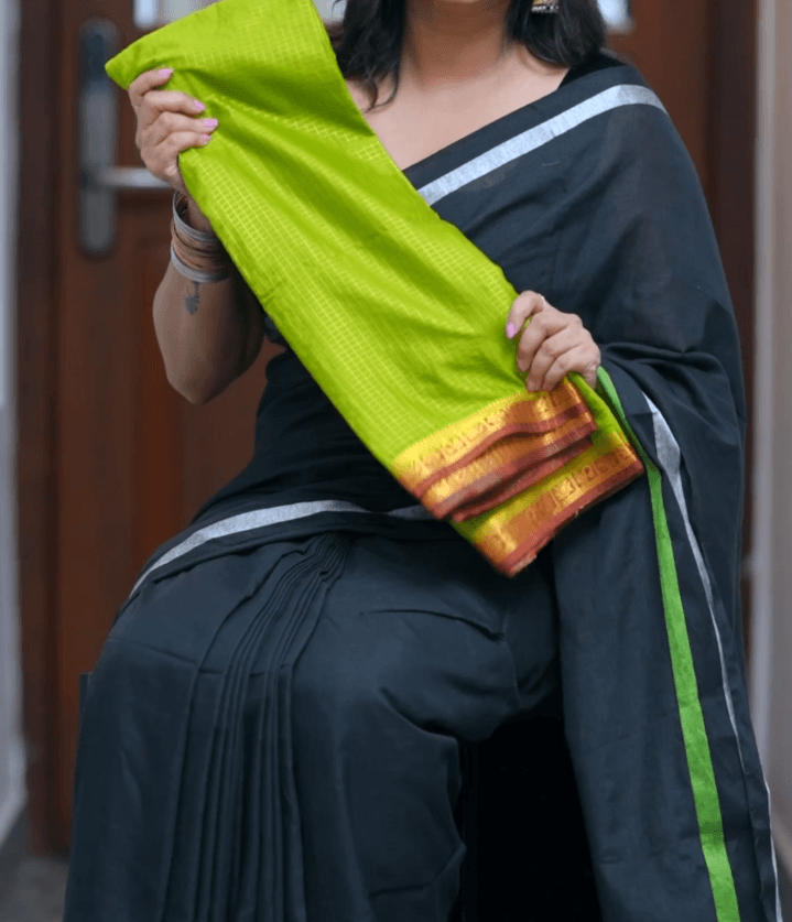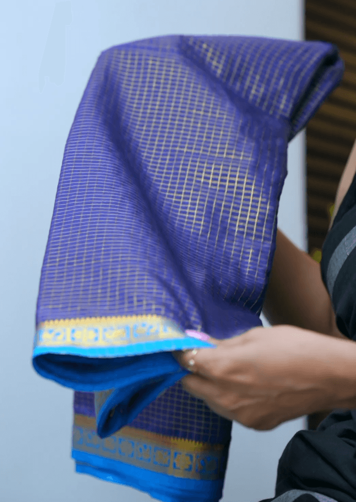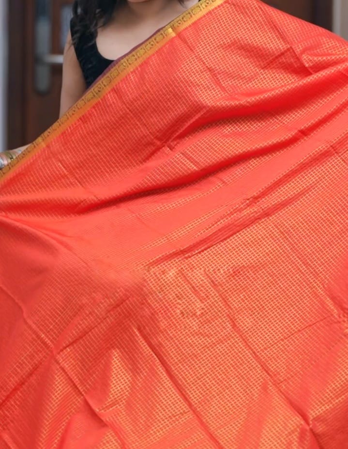 Introducing our new saree as “Thingal” new mysore crepe silk saree with check pattern all over body and contrast border and blouse piece attached.
